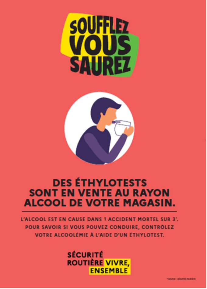 Il s'agit d'une affiche au format A4 avec un fond rouge orangé, qui représente une personne en train de souffler dans un éthylotest.