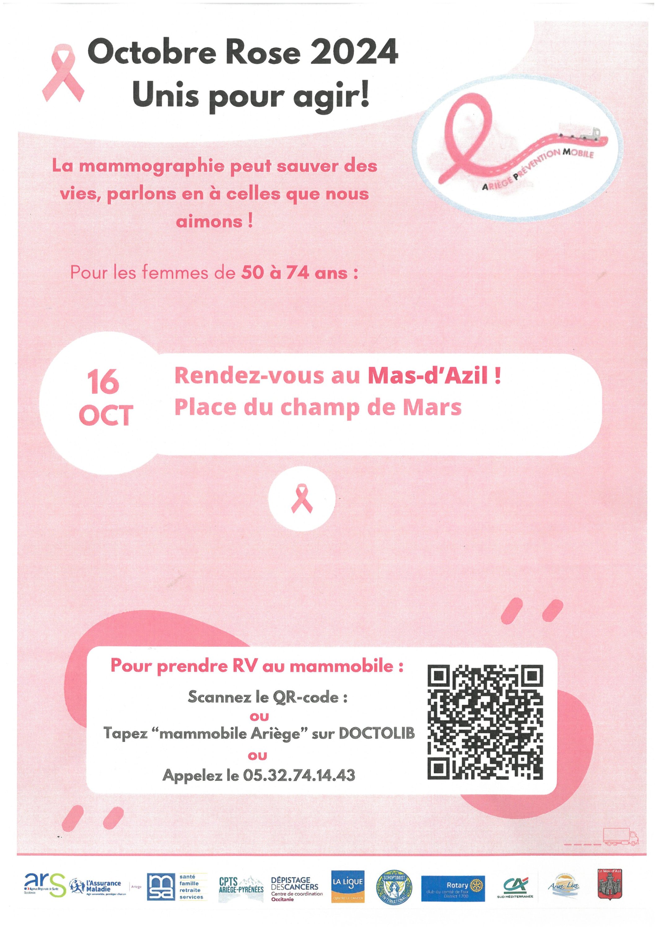 Agenda du 16 octobre 2024 Octobre Rose - Mammobile au Mas-d’Azil Mercredi 16 octobre 2024 - Le Mas-d'Azil